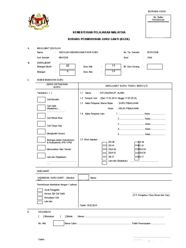 Semoga perkongsian pada kali ini iaitu borang permohonan guru ganti 2019 kini tersedia sedikit sebanyak dapat membantu individu. Pemohon tidak perlu ke sekolah untuk memohon dan ppd akan menjalankan tugas mereka untuk menempatkan anda sebagai guru ganti. Borang permohonan bantuan persekolahan sila tandakan ( / ) pada ruangan berkaitan. Borang permohonan dokumen sokongan status kes kuatkuasa spad. Sila hubungi & hantar permohonan anda ke alamat email yang dinyatakan di.