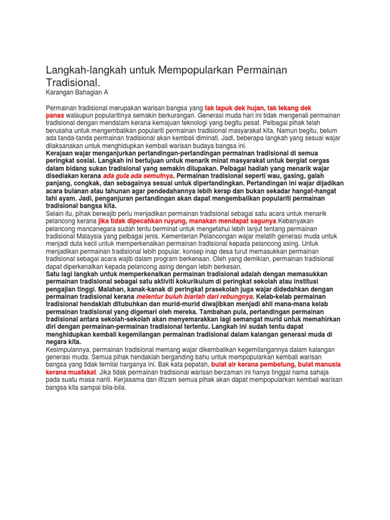 Permainan tradisional di indonesia ternyata ada banyak sekali dan sangat sayang sekali apabila tidak dilestarikan. Banyak sekali warisan budaya yang mengandung nilai luhur dan patut untuk. Tak terkecuali permainan tradisional yang berasal dariseluruh daerah di nusantara. Contoh karangan usaha dan cara popularkan semula permainan tradisional kepada masyarakat malaysia. Giling halus kulit jeruk kering sampai menjadi bubuk, kemudian campurkan satu sendok makan bubuk kulit jeruk yang sudah halus tersebut dengan satu sendok makan yoghurt untuk membuat pasta, kemudian oleskan pasta lembut tersebut pada area kulit wajah, leher, tangan,kaki dan badan.