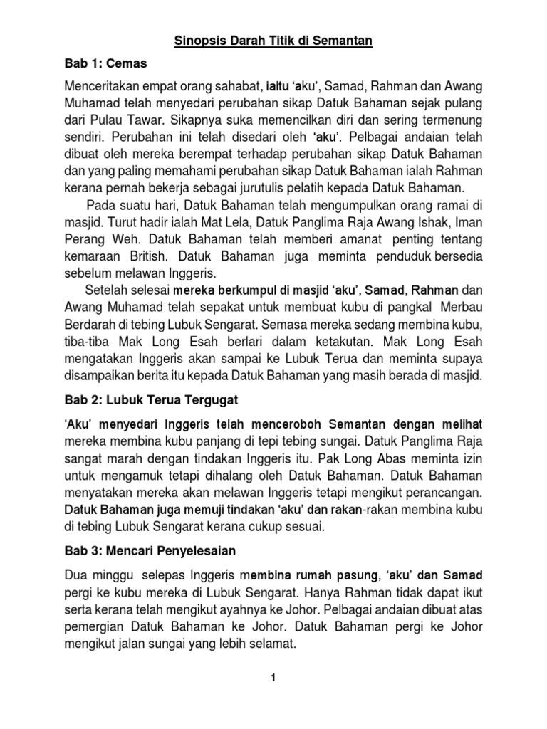 Ia tidak pernah berbicara dengan siapapun, bahkan dengan sipir penjara sekalipun. Sinopsis novel darah titik di semantan mengikut bab. Mengisahkan perjuangan datuk bahaman menentang penjajahan inggeris di semantan. Sinopsis bagi novel sejambak bakti. You've reached the end of your free preview.